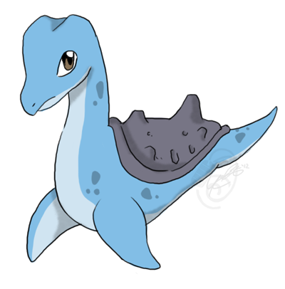 A Lapling's shell is just big enough to carry an average sized youth. However, its fluctuating method of swimming tends to make for a nauseating ride. It is a shy but playful Pokémon that observes others from below the water's surface, arching its back in order to appear to be a rock.